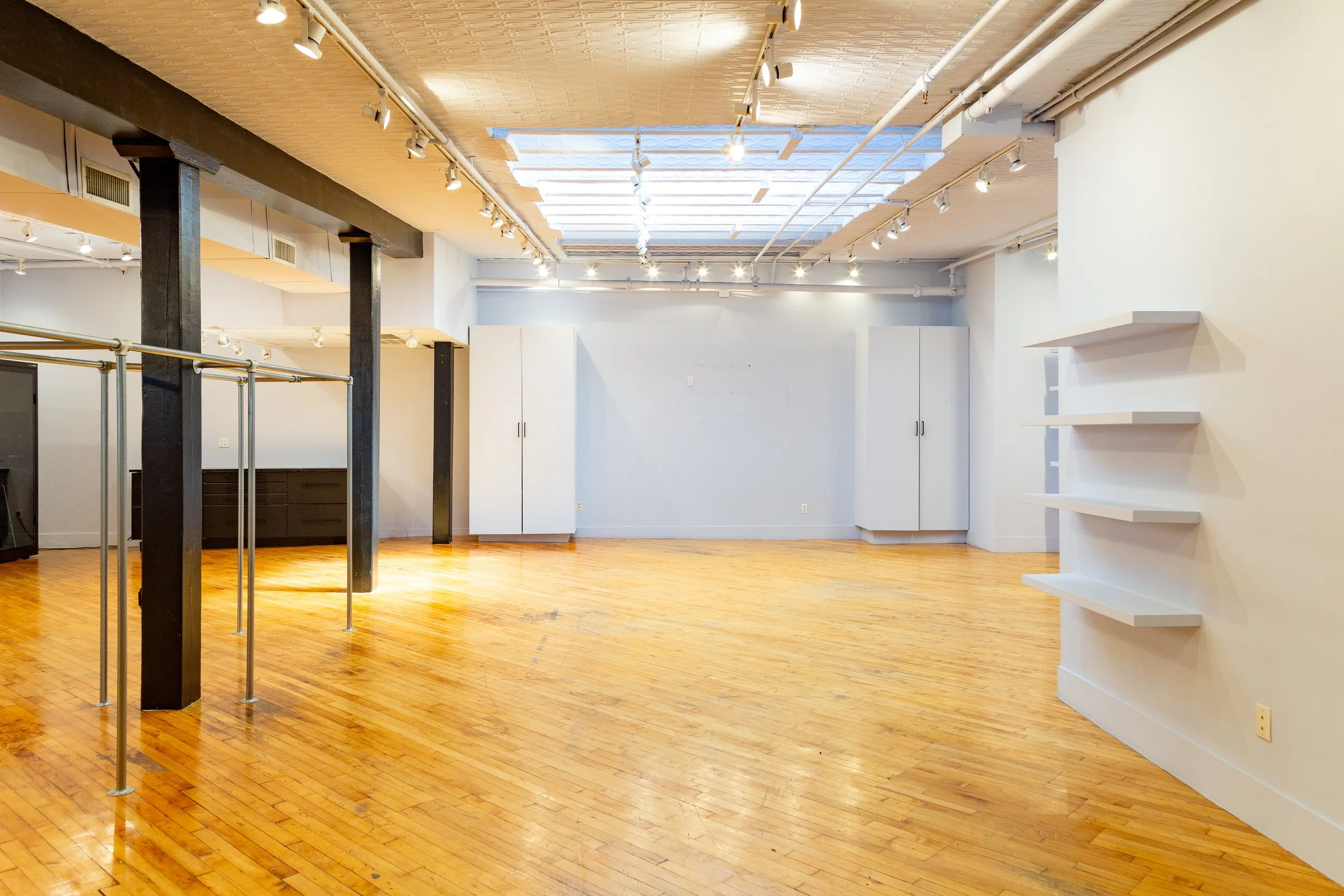 A 3,500 SF office space available on the top floor. It is built out as an showroom space with private offices. Space features southern exposure, skylight, original hardwood flooring, cast iron columns, central HVAC and tin ceiling.